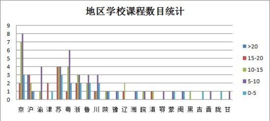 從圖10中可以看出,學校開課數目較多的地區為:北京,上海,江蘇,廣東以及浙江地區,并且開設課程數目在10-20門之間。然而,其他地區不僅開設課程數目少,集中在0-10門。