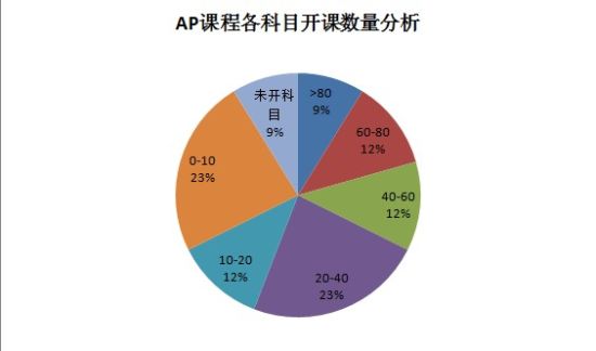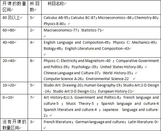 1.開課較多的課程是微積分,微觀經濟學,化學,物理等幾門課程。全國共有114所學校的至少80所學校開設了以上幾門課程,即中國地區70%的AP學校開設了數學,經濟,物理,化學課程;其次為宏觀經濟學,統計學。