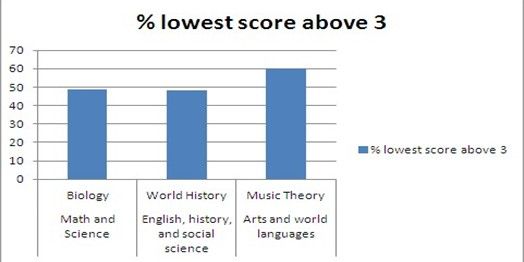 較難得3分及以上的科目:數學科學組為生物;英語歷史和社會科學組為世界歷史;藝術和外語組為藝術史。