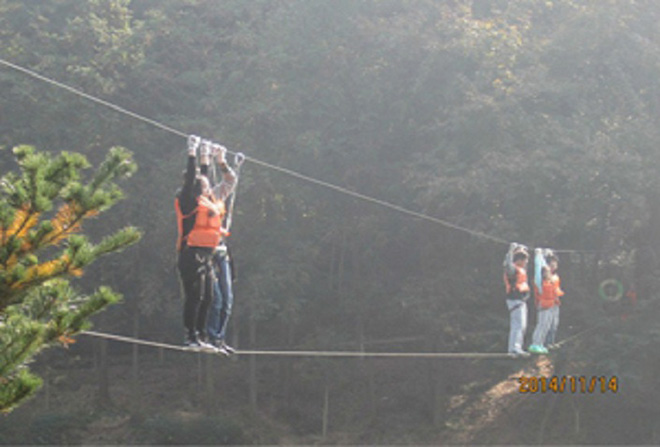 纜繩下是湍急的河流,學生們只能通過兩根繩子橫渡河流。這一驚險的項目并沒有嚇跑我們的學生。他們一個個躍躍欲試,小心翼翼的走上纜繩,較終完成了這一環節。