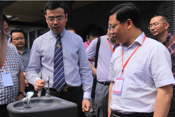 ——校領導為訪客講解具有防潮自潔的納米漆墻及位于教室門口的直飲水