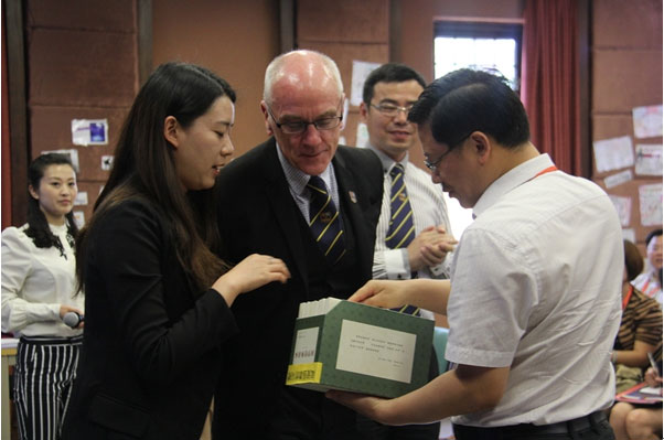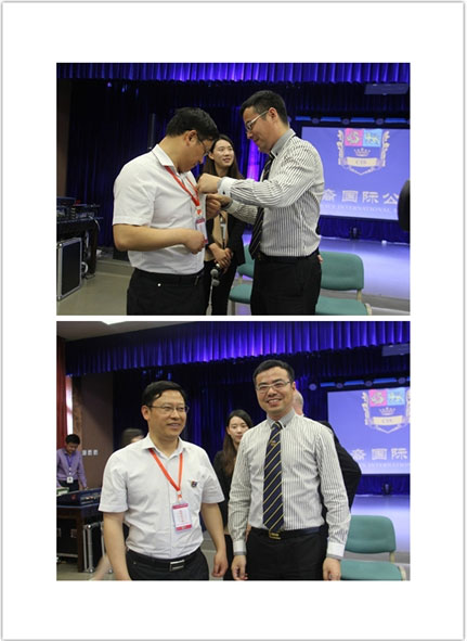 ——校領導給來訪團發送我校校徽,別看小小的校徽,可是凝聚著孔裔雙三元色的教學理念,意義非凡